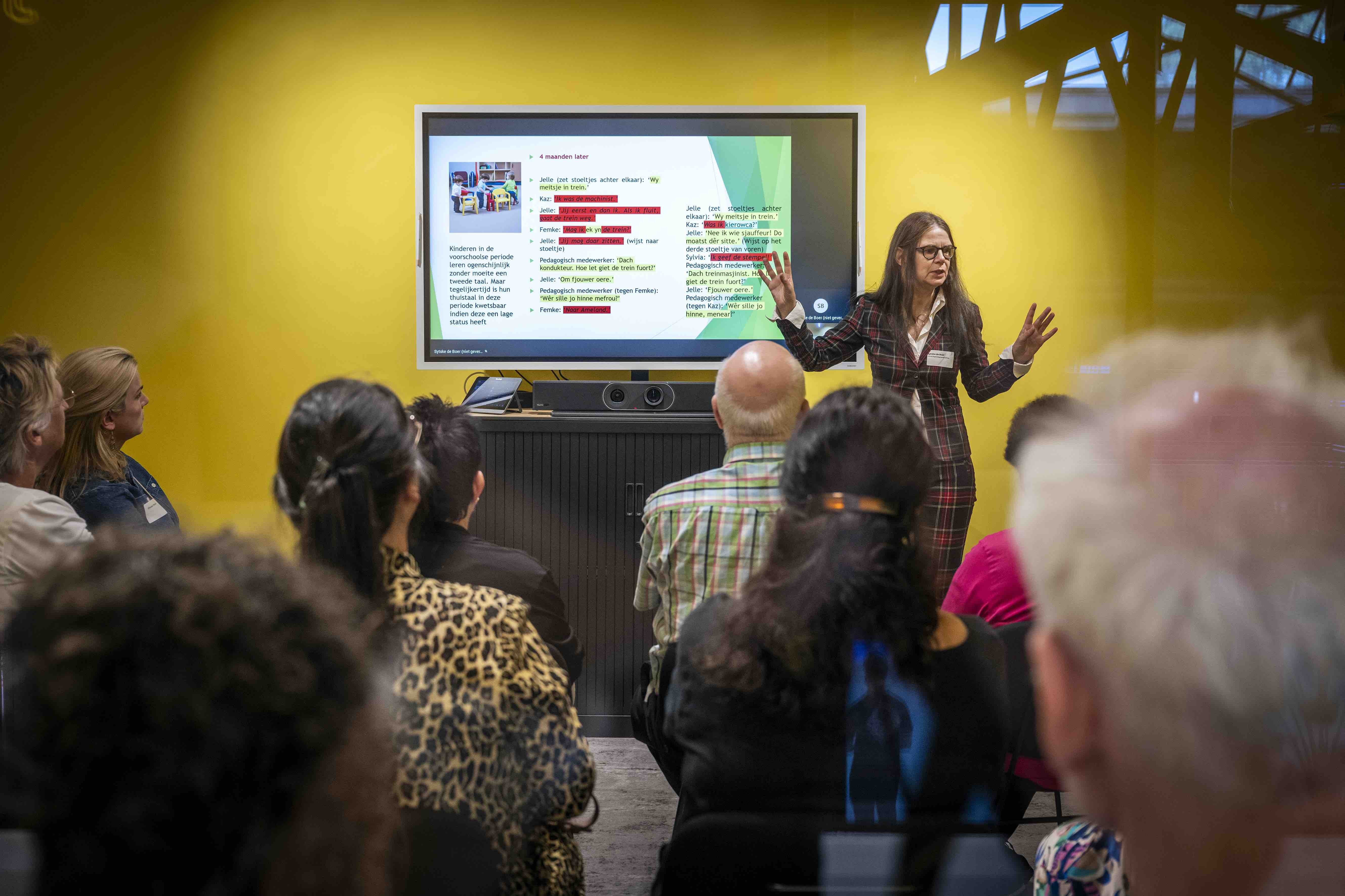We mochten genieten van de theater- en vertelkunsten van Peggy Alofs van Goud Verteltheater en de muzikale klanken van Dyanne Sleijpen, die ons op een verbindende wijze door het programma begeleid heeft. Er werd gesproken over de route naar erkenning van het Papiaments (Ruben Severina, Stichting SPLIKA & Akademia Papiamentu en Sharité Severina, Openbaar Lichaam Bonaire) en de talige ontwikkeling van peuters (Sytske de Boer, Sintrum Frysktalige Berne-opfang). Ook kwamen de thema’s meertaligheid in de klas (Mirjam Günther en Janke Singelsma, Lectoraat Meertaligheid & Geletterdheid NHL Stenden), tips en tricks om VO-leerlingen in streektaal te laten schrijven (Myrthe Coret-Bergsta, Lectoraat Meertaligheid & Geletterdheid NHL Stenden) en streektaal op de pabo (Jordi Jager, Lectoraat Meertaligheid & Geletterdheid NHL Stenden) aan bod. Een digitale lexicale infrastructuur voor het Papiaments, dialecten en streektalen werd getoond (Katrien Depuydt en Veronique De Tier, Instituut voor de Nederlandse Taal).